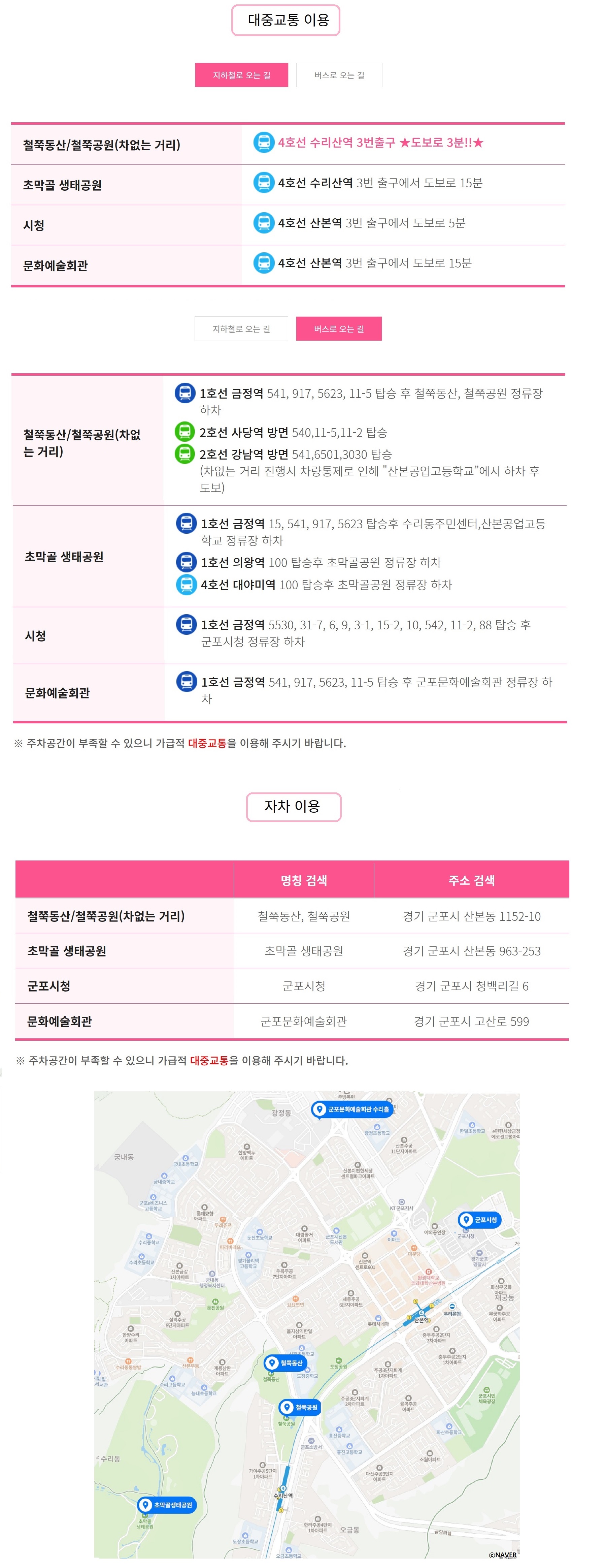 버스를 이용할 경우 1호선 금정역이나 2호선 사당·강남 방면에서 운행되는 노선들이 철쭉공원 정류장으로 연결되므로, 교통편도 매우 편리하답니다. 군포 철쭉축제 주차 고민 없이 편안하게 다녀오시려면 대중교통이 정답이에요.